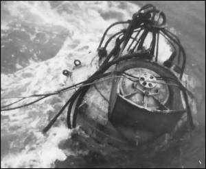 Getting the diver down to the float valve, which rested in the sea bed directly under the listing conning tower, posed complications, the diver having to pass through the extended after periscope and telescopic radar aerial, very close to a tangle of lose radio aerials.