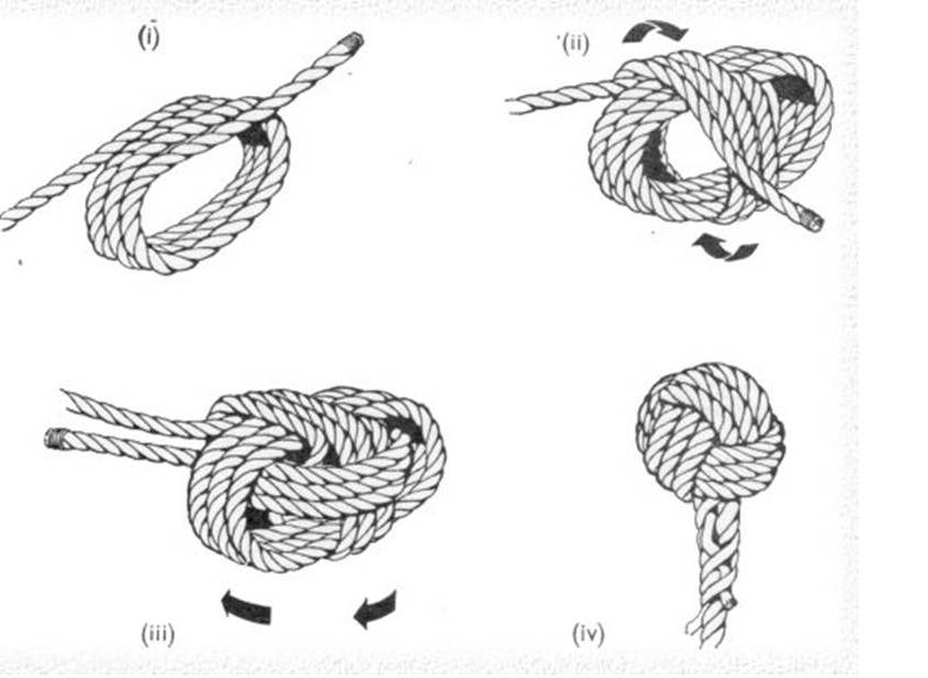 The usual method of weighting the end is to construct a heavy knot known as a Monkey’s Fist. Using almost 3-metres of the line, a Monkey’s Fist is made by first winding three turns around the hand. Next wind a second set of turns across and around the first three, and then pass a third trio of turns around and across the second three but inside the first set. When the knot is correctly made, the end will come out alongside the standing part of the line.