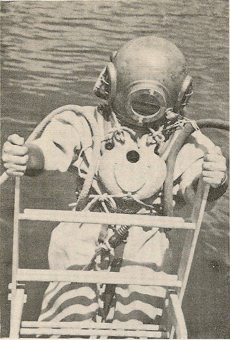 Reliant on an umbilical hose to the surface and with communications limited to a coded system of simple pulls and tugs on the lifeline, these early divers exercised extreme care in ensuring that their air hose didn’t become fouled or sliced on sharp undersea objects. Should the air supply fail for any reason then the water pressure would easily crush the flexible suit and, until the advent of the non-return valve, force the diver’s body up into the rigid helmet to a gruesome death.