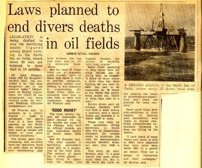 With demand for qualified divers to work on the offshore oil and gas platforms outstripping supply, recruitment programmes focussed on the supposedly huge earnings on offer. Virtually anybody with diving training could sign up to pit their wits and meagre expertise against the world’s worst diving conditions. (One of the reasons why the recruitment of ex-Navy Divers proved so popular. At least they had a good underwater experience and could survive far better than a recreational scuba diver in the North Sea.)
