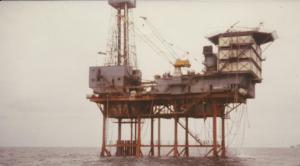 The platform’s base had been towed into position on a large, purpose-built construction barge. Valves allowing free flooding of the legs were opened and the entire structure tilted and, with the aid of the barge’s heavy-duty crane, settled into an upright position on the seabed. The conical plugs sealing the bottom of each leg would then be removed and pilings driven down inside the legs to firmly anchor the platform in position.