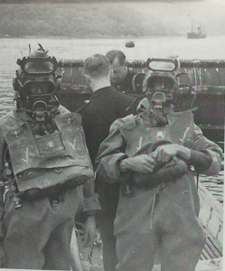 Australian Sub-Lieuts Henty-Creer (Left – CO of X5 during attack on the Tirpitz) & Max Shean (CO of X24 and, later, XE4.) during Diver and X-craft training. The bulky dress was later replaced by a more ‘streamlined’ model.
